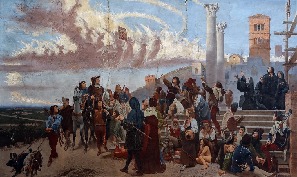 Due soldati la videro staccarsi dal muro e attraversare il cielo, come sollevata da un respiro divino, sorretta – dicono – dagli angeli. Sorvolò mari e terre e giunse, il 25 aprile dello stesso anno, a Genazzano, vicino a Roma. Apparve sulla parete di una cappella costruita da una vedova, Petruccia, che aveva consacrato tutta la sua vita alla speranza.